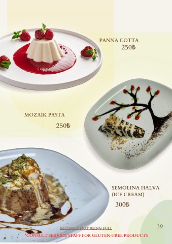 PANNA COTTA 250₺ MOZAİK PASTA 250₺ SEMOLINA HALVA (ICE CREAM) 300₺ 39 EATING IS NOT BEING FULL E A T I N G I S N O T B E I N G F U L L *CONSULT SERVICE STAFF FOR GLUTEN-FREE PRODUCTS