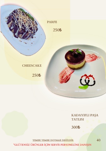 PARFE 250₺ CHEESCAKE 250₺ KADAYIFLI PAŞA TATLISI 300₺ YEMEK YEMEK DOYMAK DEĞİLDİR 40 Y E M E K Y E M E K D O Y M A K D E Ğ İ L D İ R *GLÜTENSİZ ÜRÜNLER İÇİN SERVİS PERSONELİNE DANIŞIN